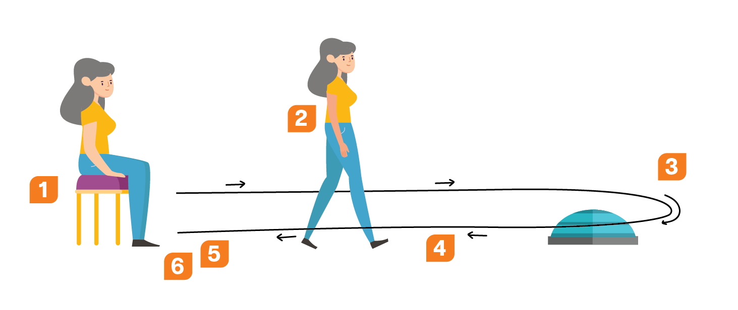 Zaman Kalk ve Yürü Testi: Zamanlı Kalk ve Yürü Testi (TUG), fiziksel performansı değerlendirmek için kullanılabilir. Yaşlı kişinin sandalyede otururken fizyoterapistin start komutuyla ayağa kalkması, 3 metre uzaktaki bir noktanın etrafında dolaşması ve tekrar sandalyeye oturması için geçen sürenin ölçümüdür. 15 saniyeden uzun süre düşme riskinin göstergesidir.