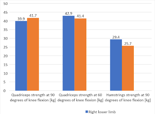 – the ratio of the strength of the left and right quadriceps femoris muscles at 90 degrees of flexion was 105%,